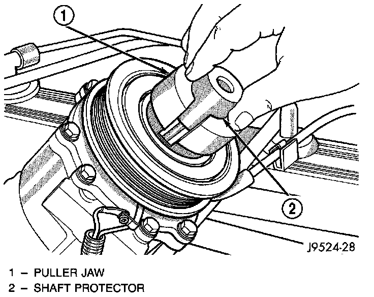 11. Install the puller through-bolts (Special Tool C-6461) through the puller flange and into the jaws of the rotor puller and tighten. Turn the puller center bolt clockwise until the rotor pulley is free.