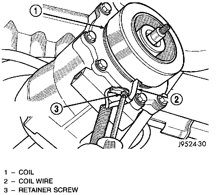 12. Remove the screw and retainer from the clutch coil lead wire harness on the compressor front housing.