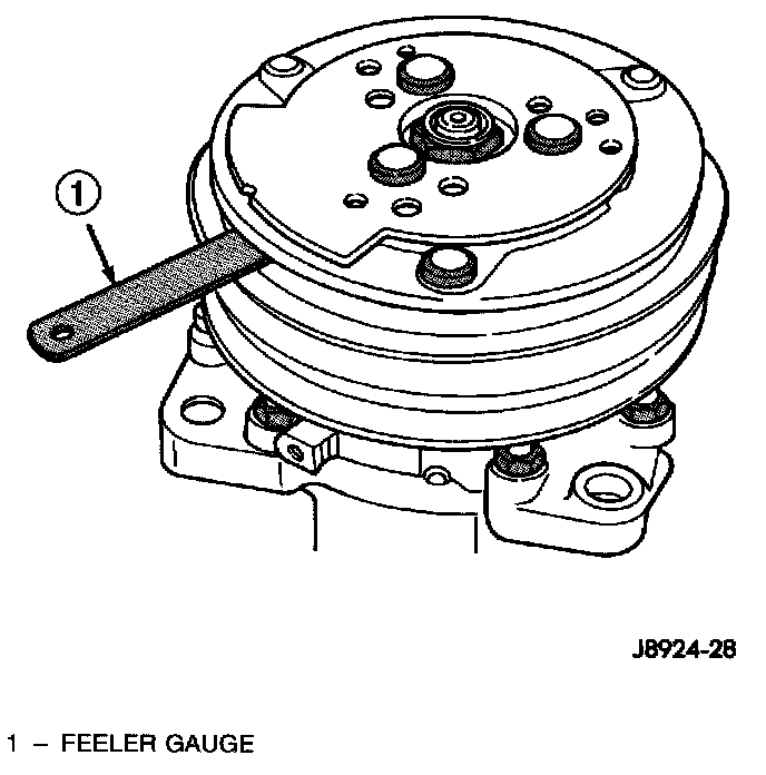 NOTE: The air gap is determined by the spacer shims. When installing an original, or a new clutch assembly, try the original shims first. When installing a new clutch onto a compressor that previously did not have a clutch, use 1.0, 0.50, and 0.13 millimeter (0.040, 0.020, and 0.005 inch) shims from the clutch hardware package that is provided with the new clutch.