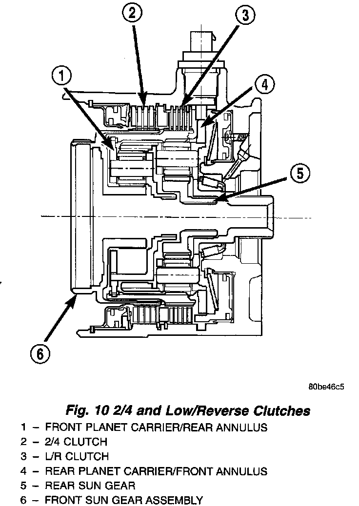 Two hydraulically applied multi-disc clutches are used to hold planetary geartrain components stationary while the input clutches drive others. The 2/4 and Low/Reverse clutches are considered holding clutches and are contained at the rear of the transaxle case. (Fig. 10).