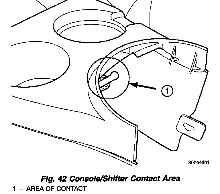 CAUTION: When installing forward console, the console will contact nylon shift release plunger (Fig. 42). If care is not used, plunger may break, requiring shifter assembly replacement.