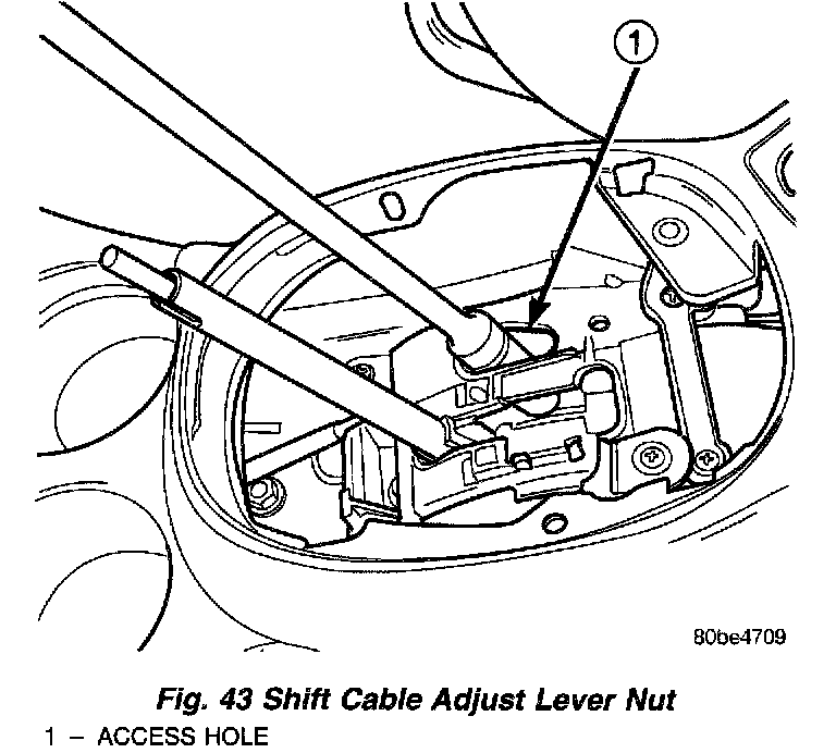 5. Loosen nut on shift cable adjust lever (Fig. 43).