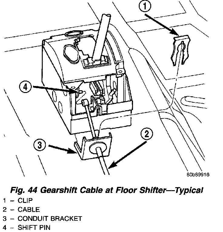 2. Install gearshift cable into conduit bracket and onto shift pin. Install retainer clip (Fig. 44).