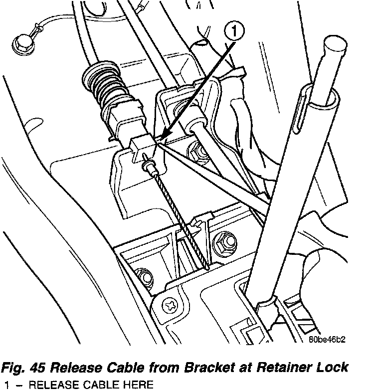 8. Release interlock cable adjuster end by inserting pointed object into shift bracket to disengage lock (Fig. 45). Unsnap the shifter/ignition interlock cable adjuster end from the slot in the gearshift mechanism bracket and disconnect cable core from shifter assembly (Fig. 46).