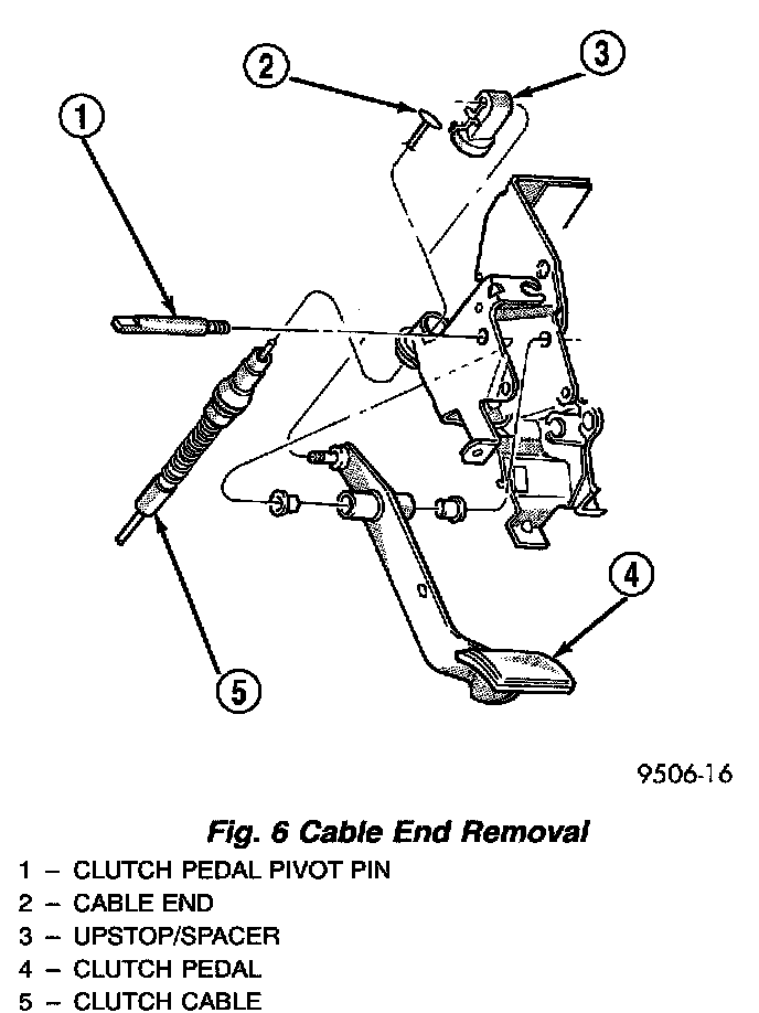 5. Disconnect clutch cable up-stop/spacer with cable strand from clutch pedal (Fig. 6).