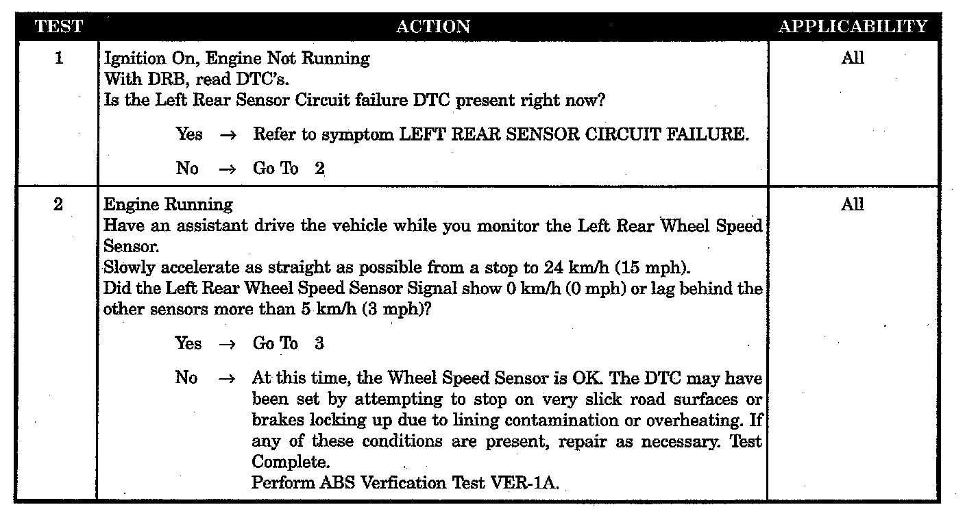 Set Condition: If the sensor signal is missing, as soon as vehicle speed exceeds 19 km/h (12 mph) the Diagnostic Trouble Code (DTC) will set. If during an ABS stop, the CAB commands any valve solenoid on for an extended length of time, and does not see a corresponding wheel speed change, the DTC is set.