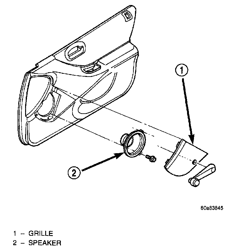 2. Remove window crank handle if equipped. Carefully, pry speaker grille away from door trim panel. Start from rear most end of speaker grille.