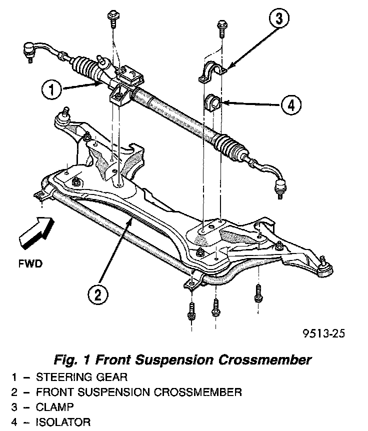 8. Remove bolts attaching steering gear to top of suspension crossmember (Fig. 1).