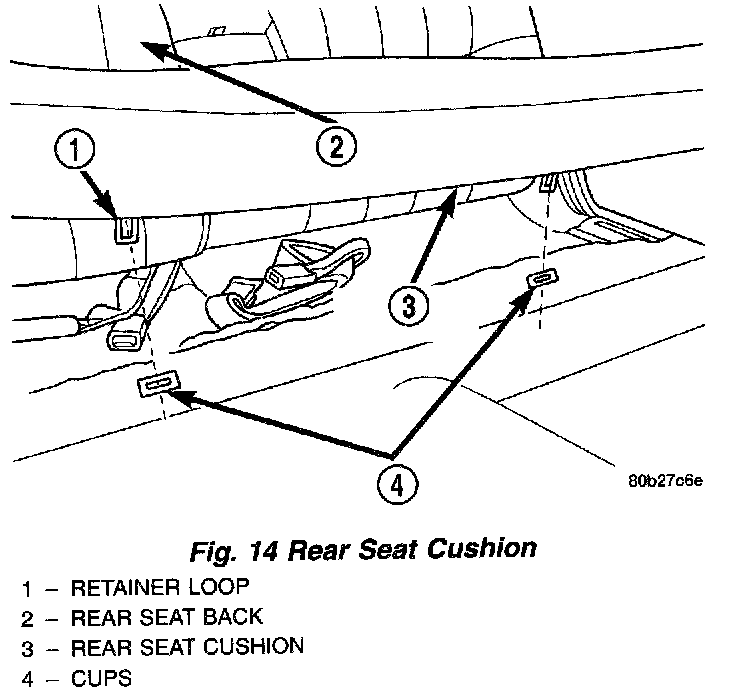 1. Pull upward at forward edge of cushion each retainer loop of the rear seat cushion to disengage retainer loops from cups in floor (Fig. 14).