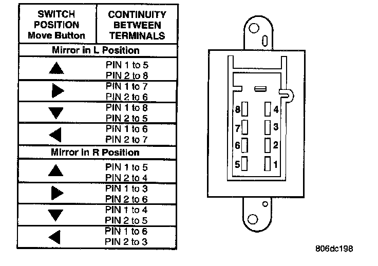 3. Using an ohmmeter, test for continuity between the terminals of the switch as shown in the Mirror Switch Test.