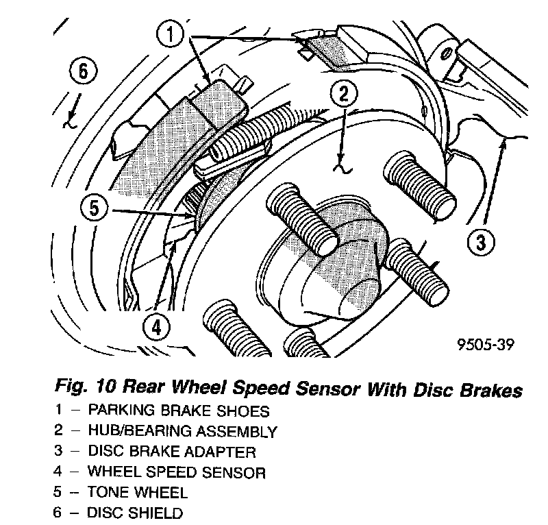 DESCRIPTIONOne Wheel Speed Sensor (WSS) and one tone wheel are located at each front and rear wheel. Each front wheel speed sensor is attached to a boss in the steering knuckle. The front tone wheel is part of the outboard constant velocity joint. The rear wheel speed sensor on rear drum brake applications is mounted to the brake support plate. The rear wheel speed sensor on rear disc brake applications is mounted to the rear disc brake adapter. The rear tone wheel is an integral part of the rear wheel hub and bearing.