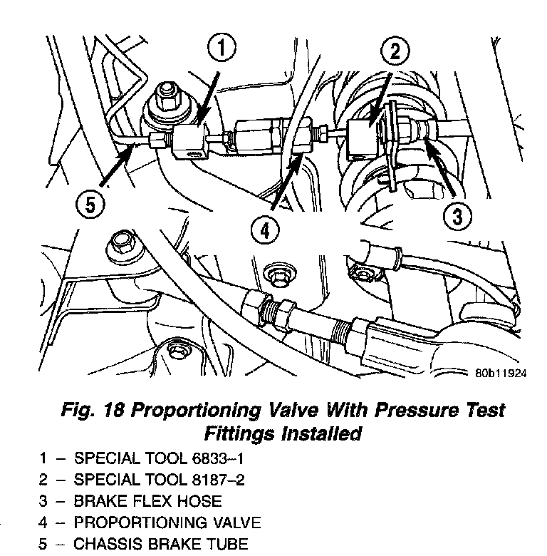 4. Install Pressure Test Fitting, Special Tool 6833-1 in the inlet port of the proportioning valve. Install Pressure Test Fitting, Special Tool 8187-2 in the outlet port of the proportioning valve . Tighten tube nuts to a torque of 17 Nm (145 inch lbs.)