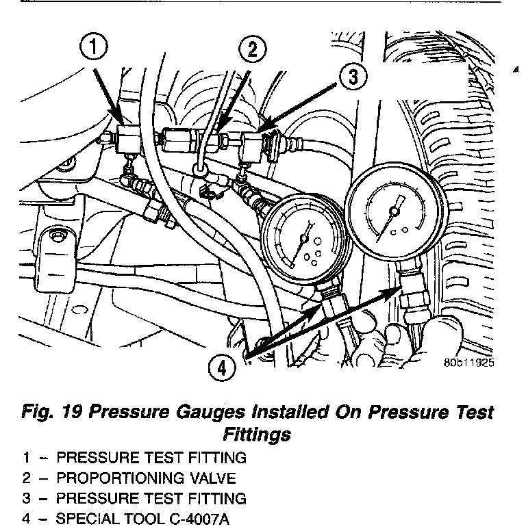 CAUTION: Be sure the pressure test fittings being installed into the proportioning valve have the correct thread sizes and flares for installation into the proportioning valve and for installation of the chassis brake tubes.