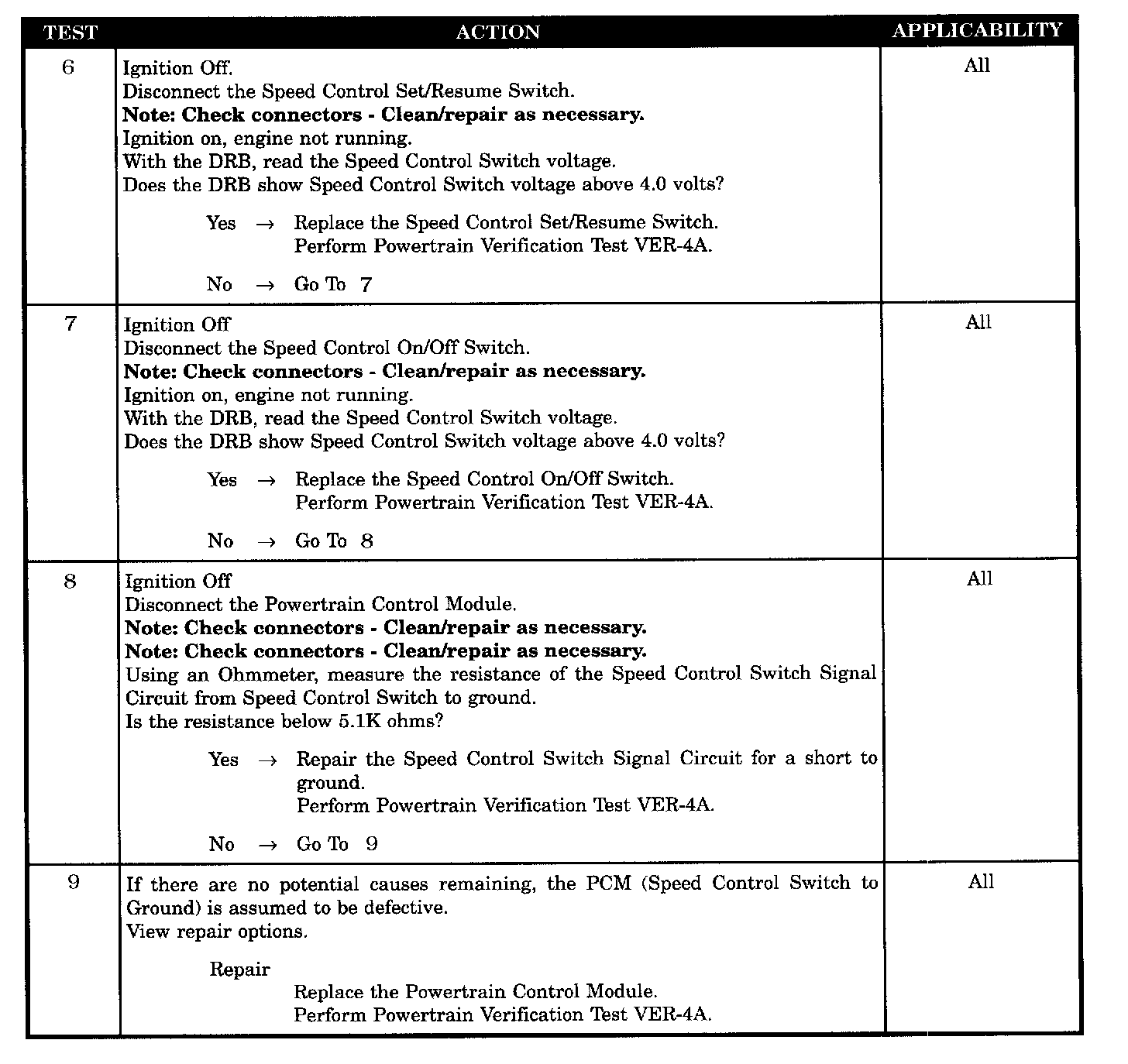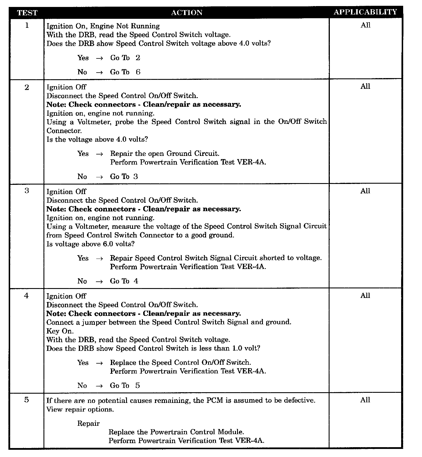 - Speed control SET/RESUME switch voltage > 4.0 volts