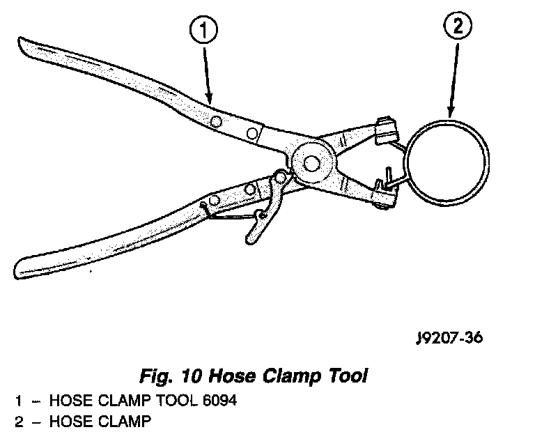 The spring type hose clamp applies constant tension on a hose connection. To remove a spring type hose clamp, use Special Tool 6094 or equivalent, constant tension clamp pliers to compress the hose clamp.