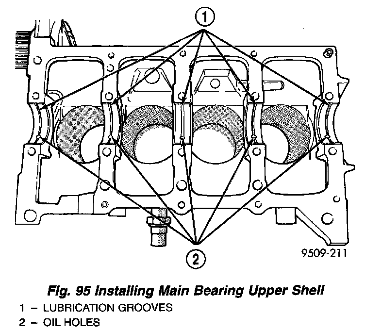 1. Install the main bearing shells with the lubrication groove in the cylinder block Fig. 95).