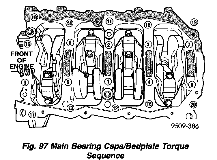 7. Install main bearing bedplate to engine block bolts 11, 17, and 20 finger tight. Tighten these bolts down together until the bedplate contacts the cylinder block.