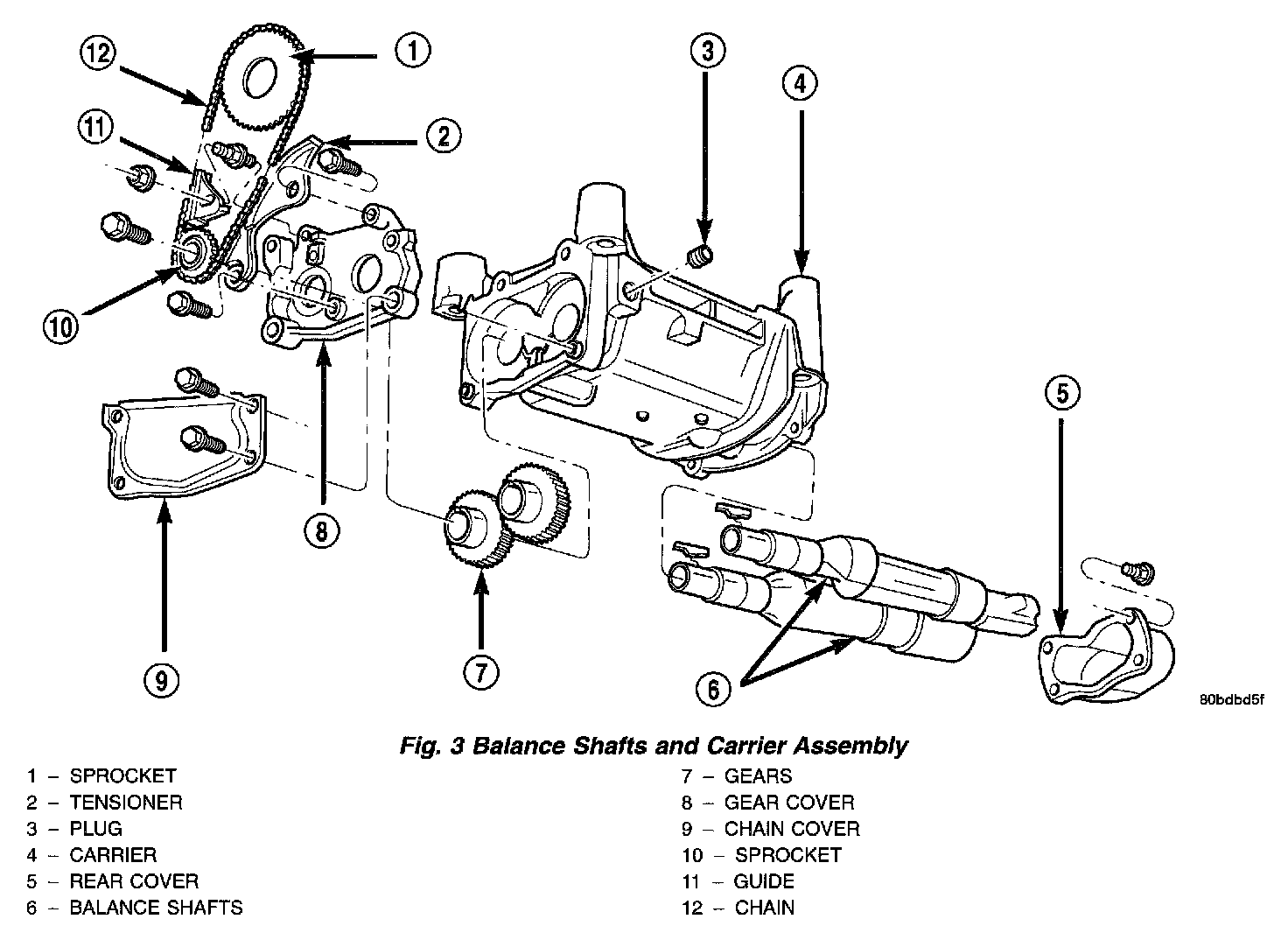 The 2.4L engine is equipped with two cast iron balance shafts installed in a cast aluminum carrier attached to the lower cylinder block.