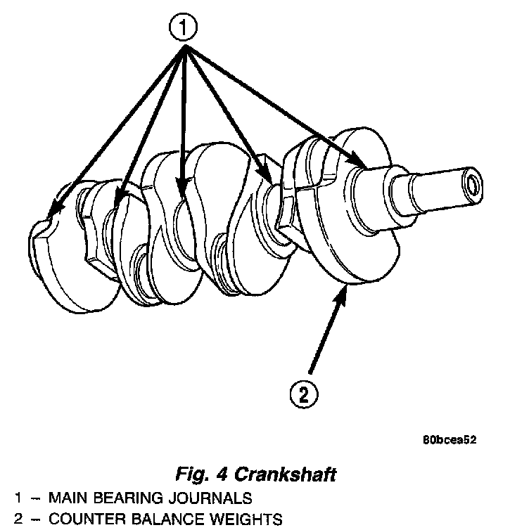 The crankshaft is made of nodular cast iron and includes five main bearing journals and four connecting rod journals. The number three journal is the location for the thrust bearing. The mains and connecting rod journals have undercut fillet radiuses that are rolled for added strength. To optimize bearing loading, eight counterweights are used.