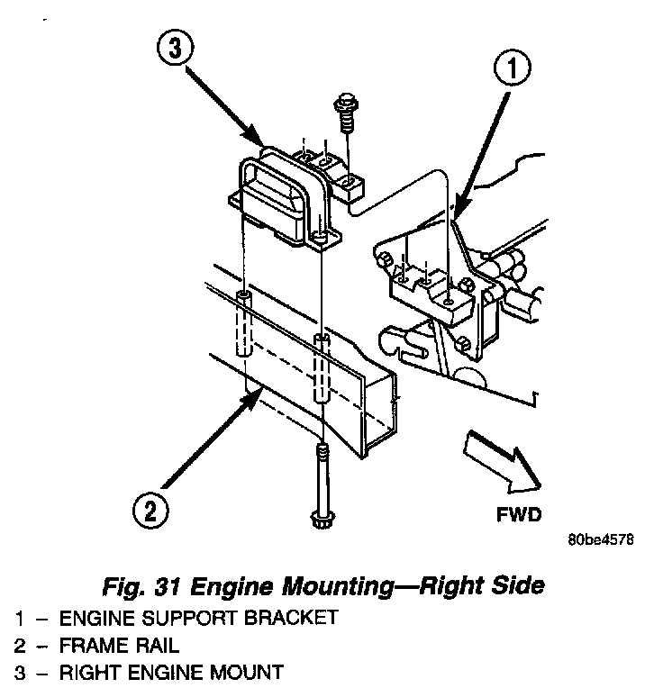 NOTE: The right side engine mount is a HydroMount and may show surface cracks. This will not effect mount performance and should not be replaced. Replace the Hydro-Mount if fluid is leaking from mount.REMOVAL