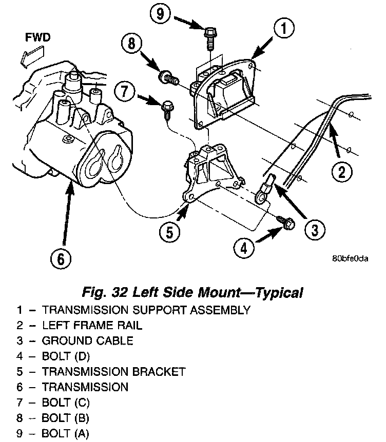 2. Remove the three vertical bolts (A) from the mount to the transmission bracket (Fig. 32).