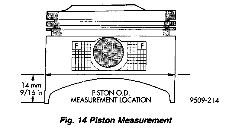 Piston and cylinder wall must be clean and dry. Piston diameter should be measured 90 degrees to piston pin about 14 mm (9/16 inch) from the bottom of the skirt as shown in (Fig. 14). Cylinder bores should be measured halfway down the cylinder bore and transverse to the engine crankshaft center line shown in (Fig. 14). Refer to for Engine Specifications. Correct piston to bore clearance must be established in order to assure quiet and economical operation.