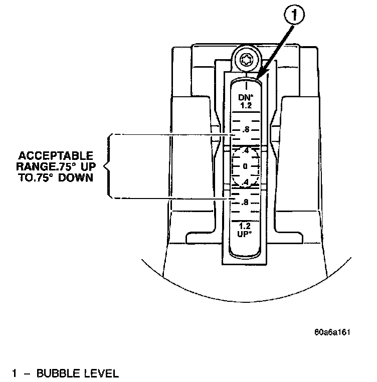 A properly aimed left low beam headlamp will project the center of the low beam hot spot on the alignment screen 8 in. (203 mm) below the horizontal center line and 5 in. (127 mm) right of headlamp center line. A properly aimed right low beam headlamp will project the center of the low beam hot spot on the alignment screen 7 in. (178 mm) below the horizontal center line and 9 in. (229 mm) right of headlamp center line. The preferred headlamp alignment is 0 (± 0.76) for the up/down adjustment as indicated on bubble level. Preferred left/right alignment is 0 (± 0.760) as indicated on the gauge wheel. The high beam headlamps cannot be aligned. The high beam pattern should be correct when the low beams are aligned properly.