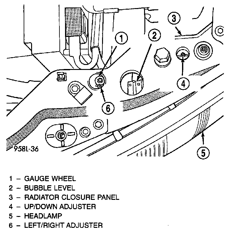 JA vehicle headlamps are equipped with a bubble level to aid up/down headlamp alignment. The bubble level is used to assist headlamp alignment when compensating for vehicle ride height changes due to heavy luggage compartment loads. The bubble level cannot be calibrated, the headlamp must be replaced if bubble level vial is faulty. A gauge wheel is located on the top of the headlamp module to assist left/right alignment.