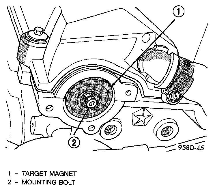 1. Install target magnet in end of camshaft. Tighten mounting screw to 3 Nm (30 in. lbs.) torque. Over torqueing could cause cracks in magnet. If magnet cracks replace it.
