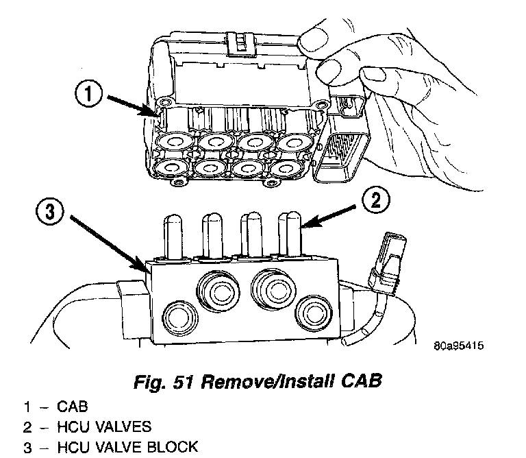 REMOVALNOTE: To replace the Hydraulic Control Unit (HCU) or the Controller Antilock Brake (CAB) on this vehicle, the entire Integrated Control Unit (ICU) needs to be removed from the vehicle. The CAB can then be separated from the HCU. Do not attempt to replace the CAB with the ICU mounted in the vehicle.