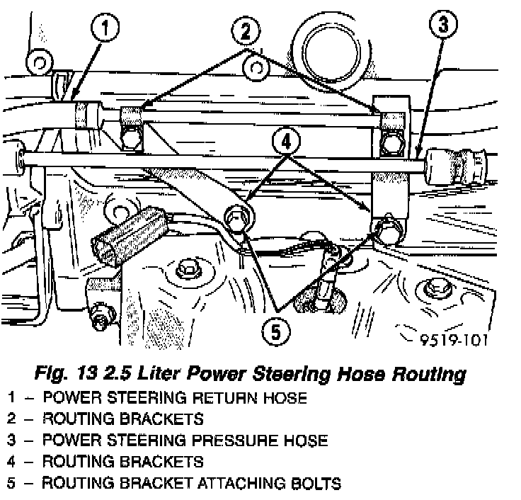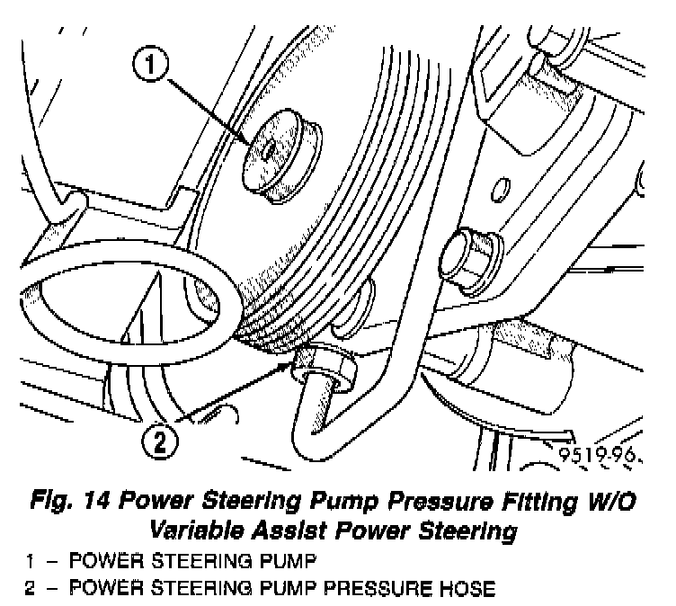 NOTE: To service the power steering pressure hose on this vehicle, the front suspension crossmember and steering gear will need to be lowered away from the body and frame of the vehicle. This is required for access to the power steering hose connections on the side of the steering gear. Refer to Suspension for the required procedure for removal of the front suspension crossmember.