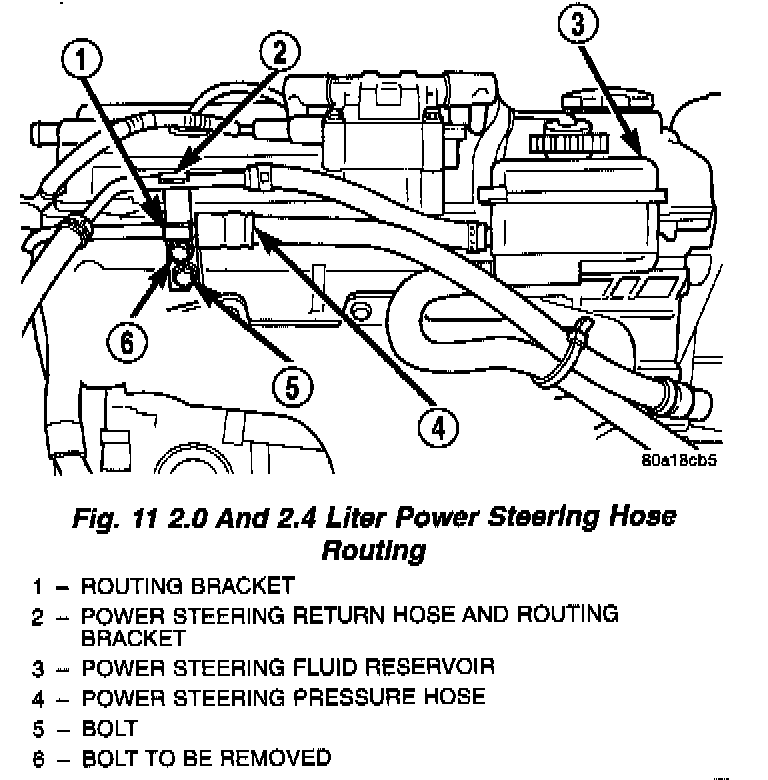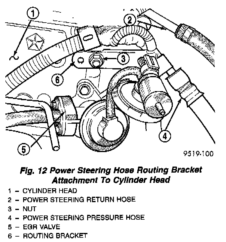 4. If vehicle is equipped with a 2.0 or 2.4 liter engine, remove power steering pressure hose routing bracket from the power steering return hose bracket on rear of engine. Then remove the nut attaching the power steering pressure hose routing bracket to stud on side of cylinder head.