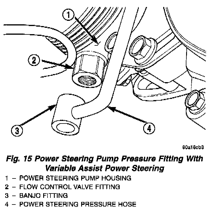 7. Remove the power steering pressure hose from the pressure fitting on the power steering pump. On vehicles with speed-sensitive variable assist power steering, be careful not to loose the copper sealing washers on each side of the fitting.