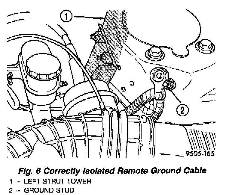 1. Remove remote ground cable from ground stud on shock tower. Then correctly isolate ground cable from vehicle by installing isolator on stud.