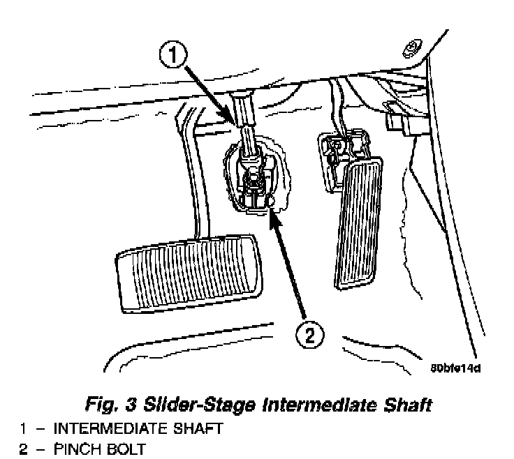 b. On later production vehicles, align the flats and slide the intermediate shaft onto the steering gear shaft aligning the pinch bolt hole with the notch formed into the steering gear shaft. Install a new pinch bolt in the intermediate shaft coupler, then tighten the pinch bolt to a torque of 34 Nm (300 inch lbs.).