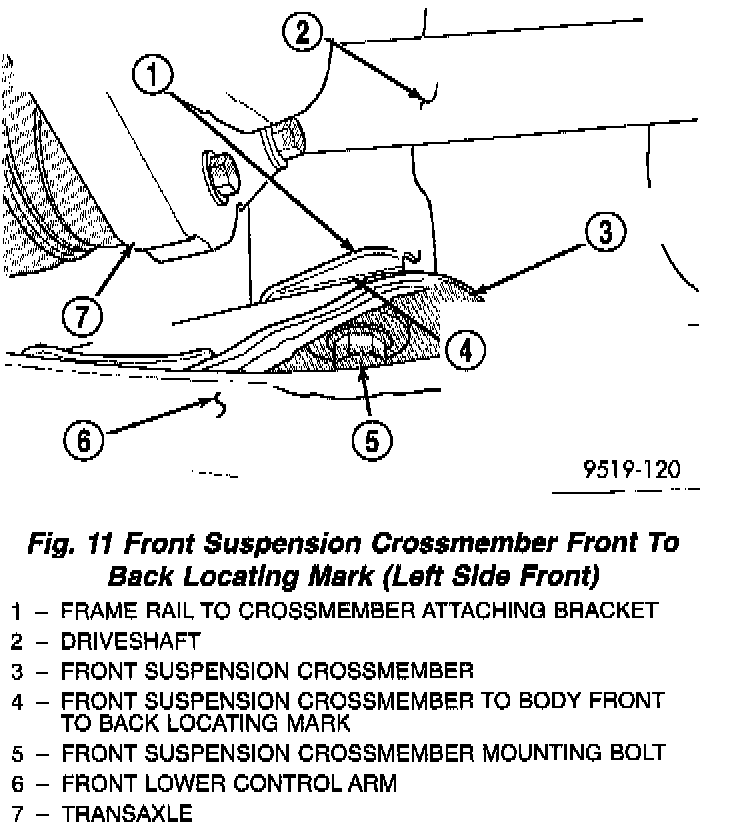 10. Using an awl, scribe a line on the front suspension crossmember marking the side to side installed location where front suspension crossmember is mounted against the body of the vehicle. The line should be scribed at the side of the frame rail bracket where the crossmember is mounted to the vehicle. The locating mark is to be marked the same on each side of the vehicle. In the left side of the vehicle is shown.
