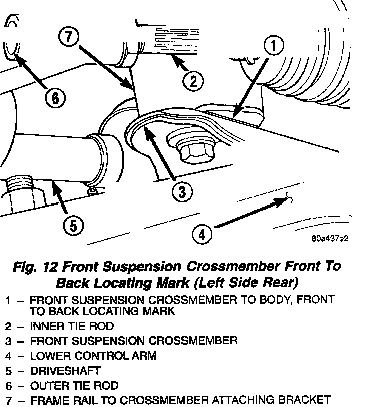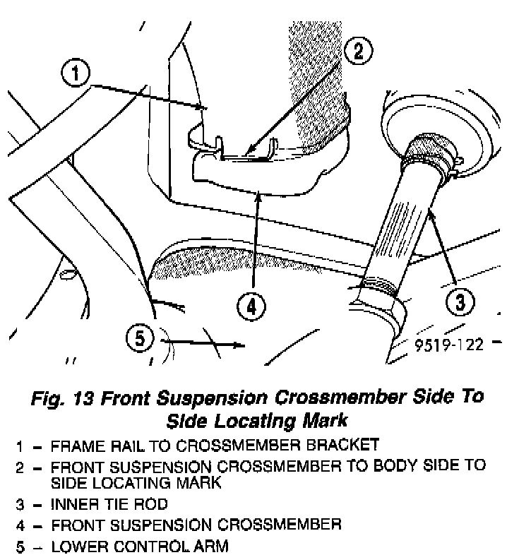 - Before removing the front suspension crossmember from the vehicle, locating marks for the front suspension crossmember MUST be scribed on the front suspension crossmember and body of vehicle. This must be done so front suspension crossmember can be located against body of vehicle, in the same location when it is installed back in vehicle. If location of front suspension crossmember to body of vehicle is not maintained when vehicle is assembled, NET BUILD front suspension alignment settings will not be obtained. This may lead to handling and or tire wear problems.