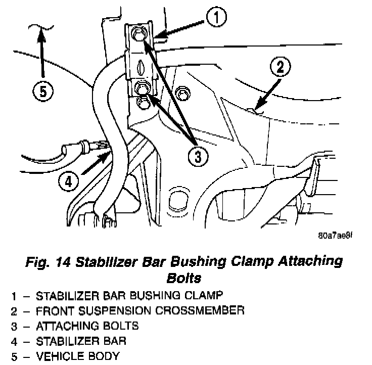 13. Install and tighten the 2 stabilizer bar bushing clamp to body attaching bolts.