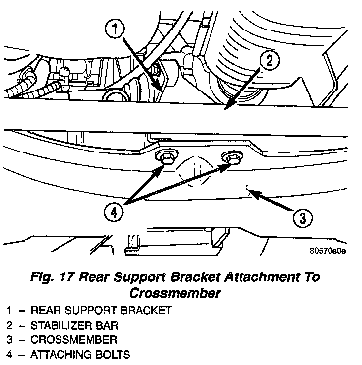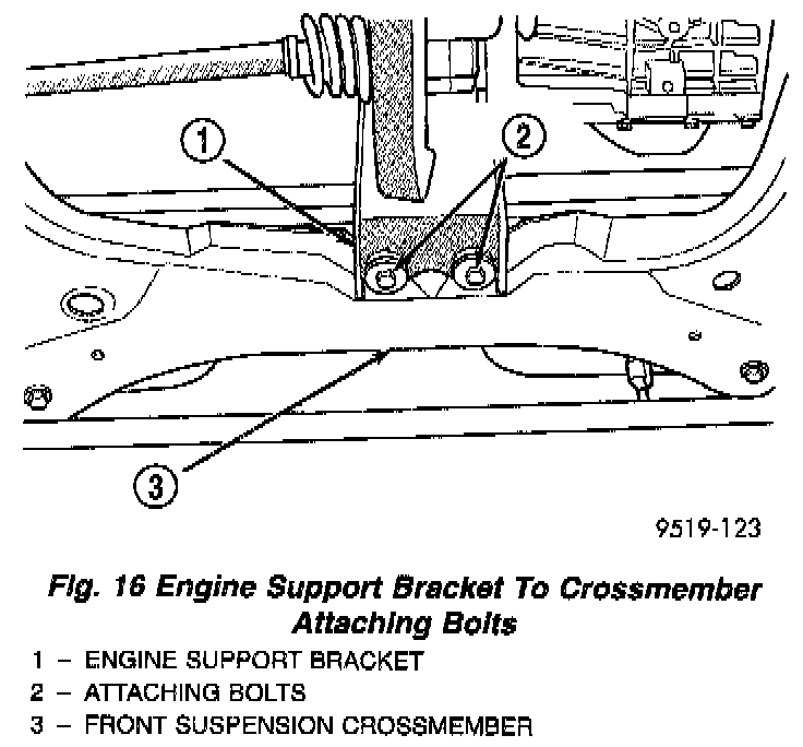 16. Remove the 2 attaching bolts from the rear support bracket at the rear of the front suspension crossmember.