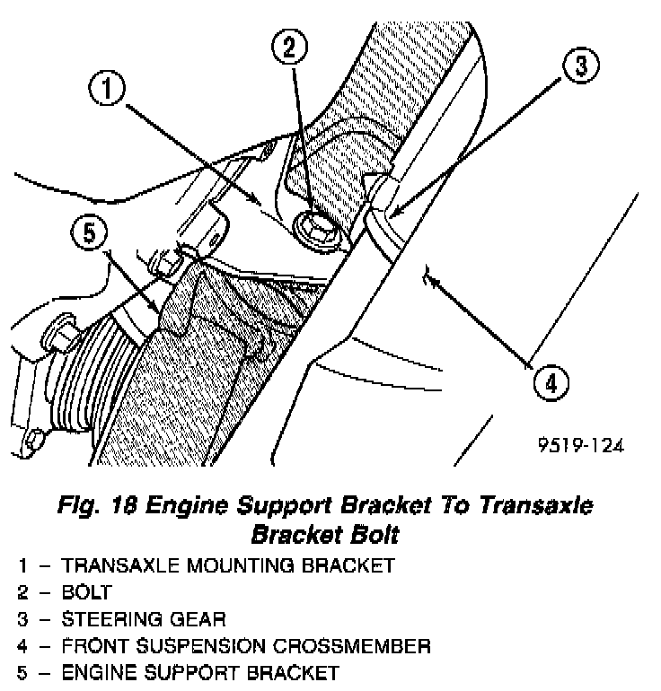17. Remove bolt attaching engine support bracket to the transaxle mounting bracket.