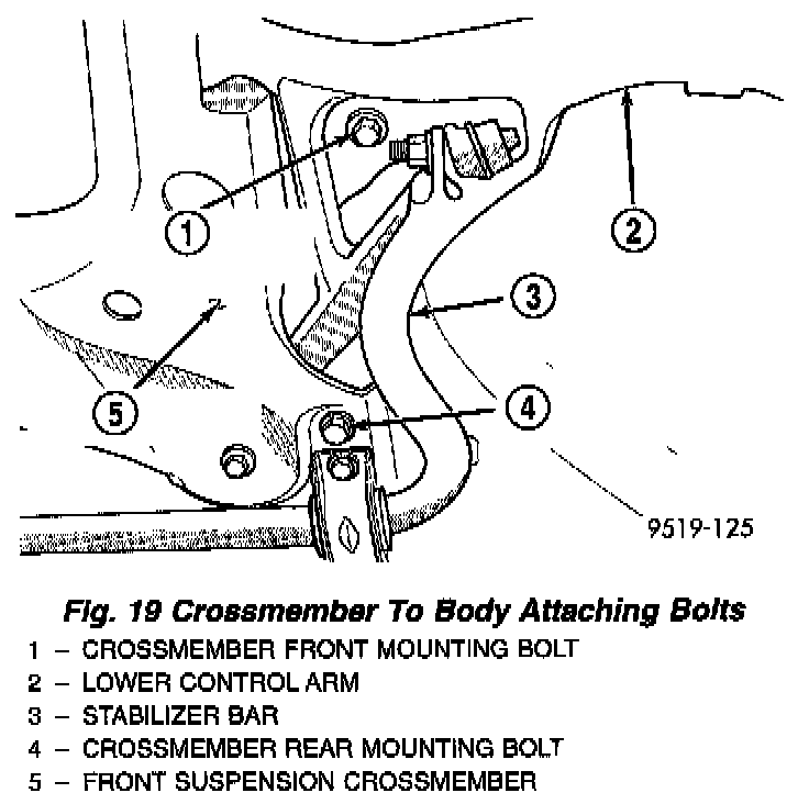 19. From each side of the vehicle, remove the 2 bolts attaching the front and rear of the front suspension crossmember to the frame rails of vehicle.