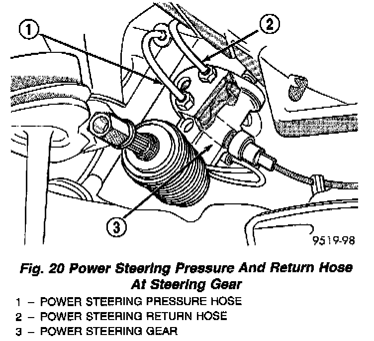 21. Remove power steering fluid, pressure and return hoses from the power steering gear assembly.