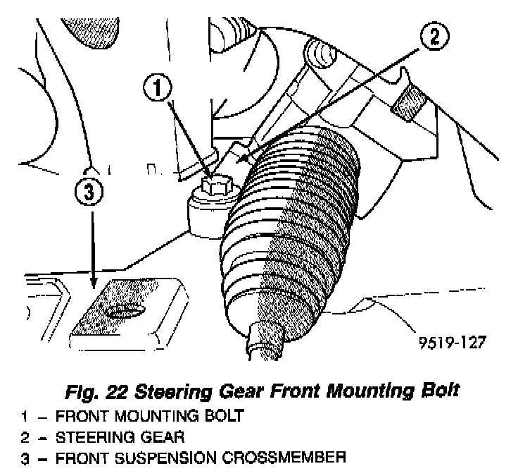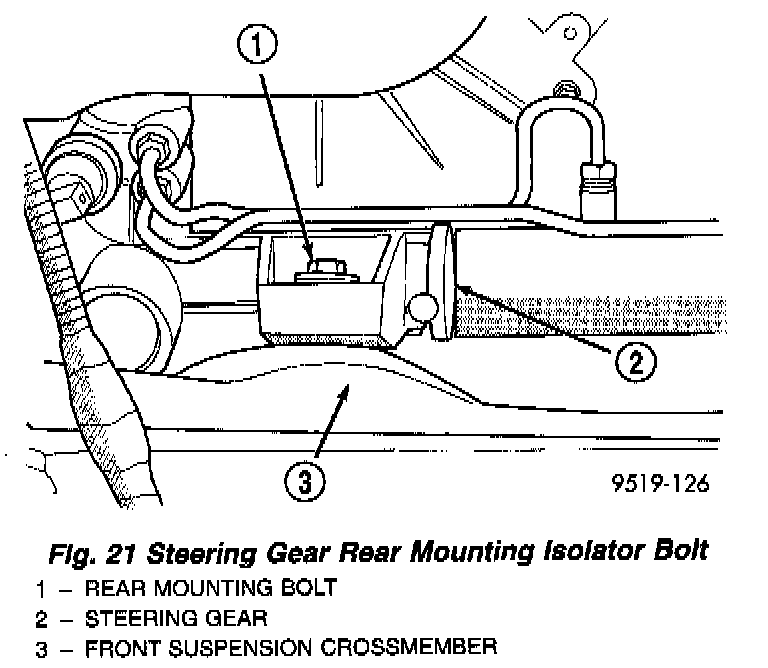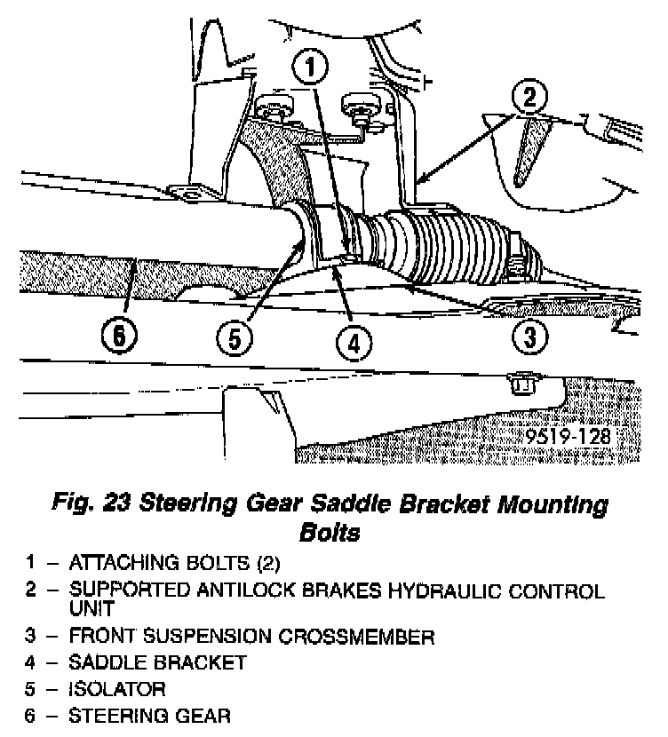 23. Remove the 2 bolts, at the isolators attaching the steering gear assembly to front suspension crossmember. Then remove the 2 bolts attaching the steering gear saddle bracket to the front suspension crossmember. Remove the steering gear assembly from the front suspension crossmember.
