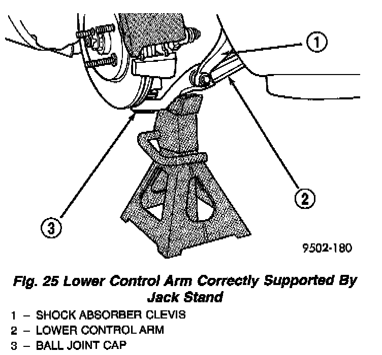 14. Lower vehicle to the ground with a jack stand positioned under the lower control arm. Continue to lower vehicle so the total weight of the vehicle is supported by the jack stand and lower control arm.
