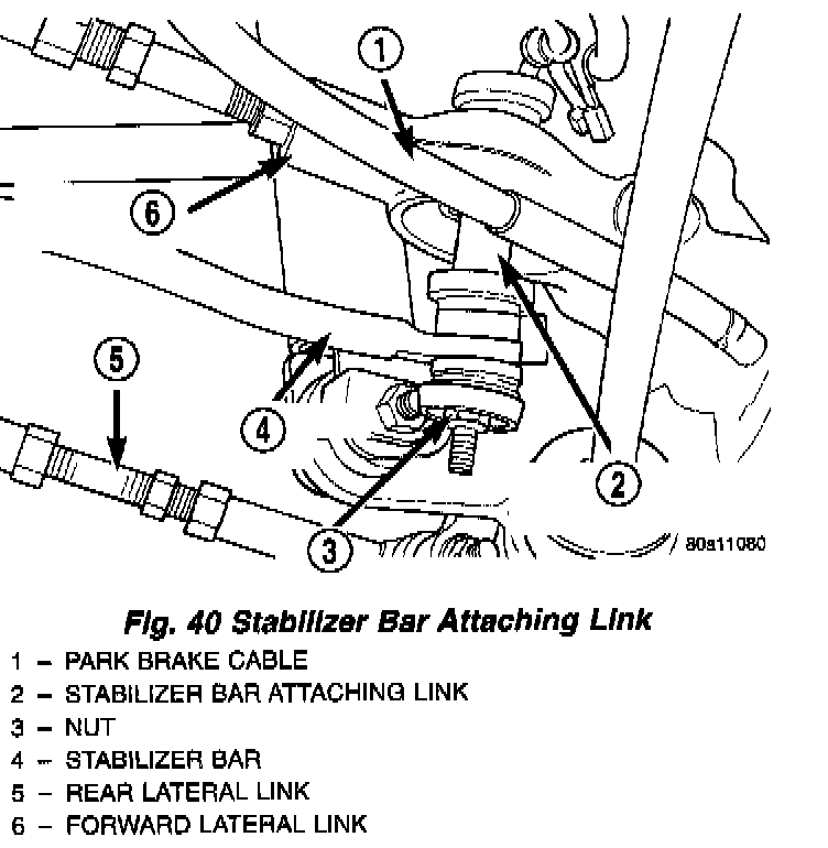 3. Install the stabilizer bar onto the stabilizer bar attaching links on the forward lateral links. Install the stabilizer bar to attaching link bushings on attaching links. Tighten the bushing retaining nuts to a torque of 32 Nm (24 ft. lbs.).
