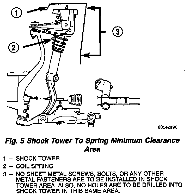 - At no time when servicing a vehicle, can a sheet metal screw, bolt or other metal fastener be installed in the shock tower to take the place of an original plastic clip. Also, NO holes can be drilled into the front shock tower in the area shown in, for the installation of any metal fasteners into the shock tower. Because of the minimum clearance in this area installation of metal fasteners could damage the coil spring coating and lead to a corrosion failure of the spring.