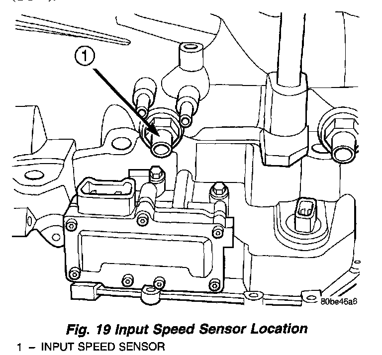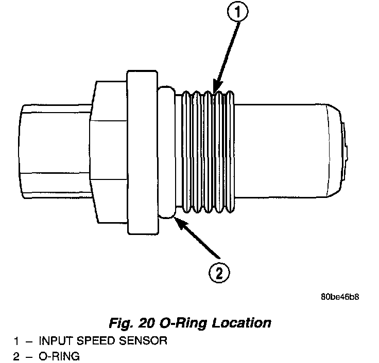 The Input Speed Sensor is a two-wire magnetic pickup device that generates AC signals as rotation occurs. It is threaded into the transaxle case (Fig. 19), sealed with an O-ring (Fig. 20), and is considered a primary input to the Transmission Control Module (TCM).