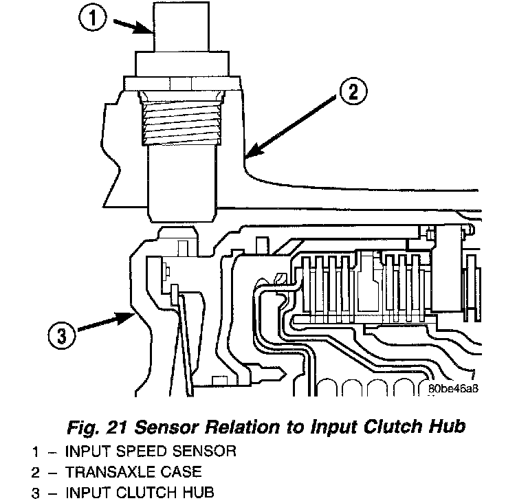The Input Speed Sensor provides information on how fast the input shaft is rotating. As the teeth of the input clutch hub pass by the sensor coil (Fig. 21), an AC voltage is generated and sent to the TCM. The TCM interprets this information as input shaft rpm.