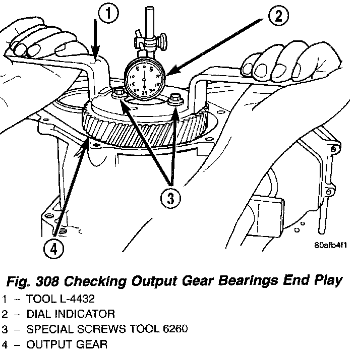 5. Using a dial indicator, mounted to the transaxle case, measure output gear end play (Fig. 308).