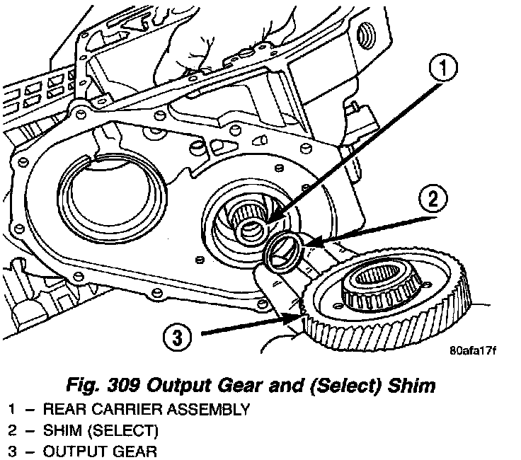 8. Remove the gauging shim and install the proper shim (Fig. 309). Use grease to hold the shim in place. Install the output gear and bearing assembly (Fig. 310).